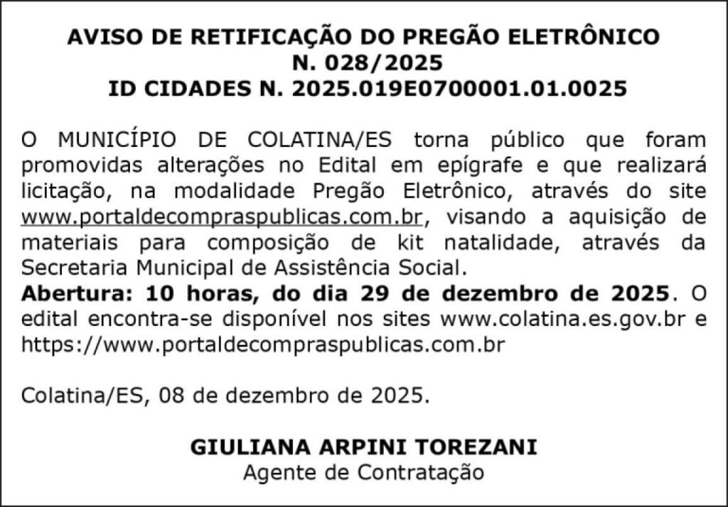 AVISO DE RETIFICAÇÃO DO PREGÃO ELETRÔNICO N. 028/2025 – PMC afolhaonline Publicidade Legal 10 de dezembro de 202510 de dezembro de 2025 0 Comentário PREFEITURA MUNICIPAL DE COLATINA – Nº 236 – COLATINA – ES, DIA 10 DE DEZEMBRO DE 2025