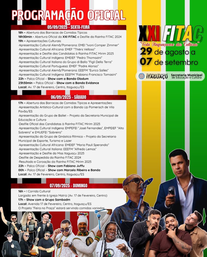 Local: Diversos pontos de Itaguaçu, com shows no Palco Oficial – Av. 17 de fevereiro.