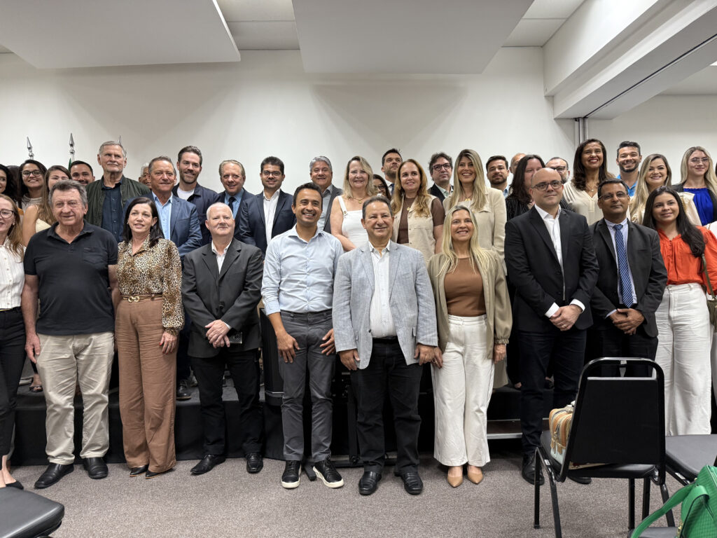Fernando Saliba, presidente do Espírito Santo em Ação, Adila Damiani, diretora executiva da Transparência Capixaba e gestores municipais, profissionais do ES em Ação e da Transparência Capixaba. foto divulgação.