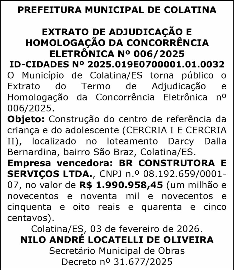 PREFEITURA MUNICIPAL DE COLATINA – Nº 250 – COLATINA – ES, DIA 10 DE FEVEREIRO DE 2026