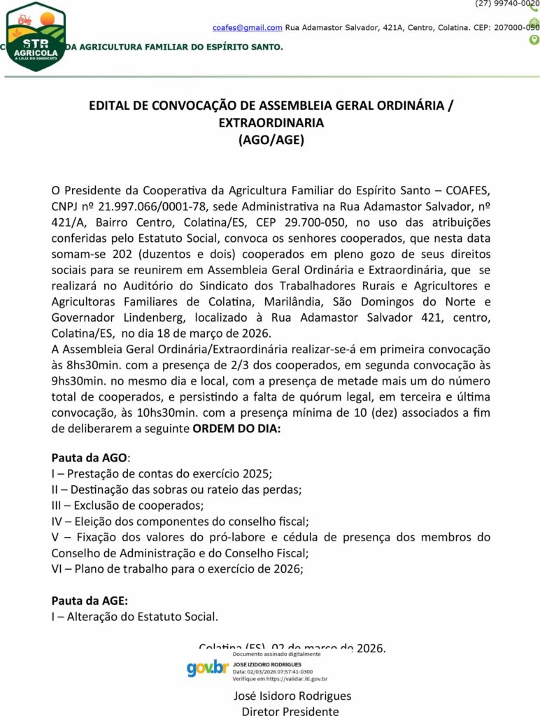 COLATINA – ES, DIA 26 DE FEVEREIRO DE 2026