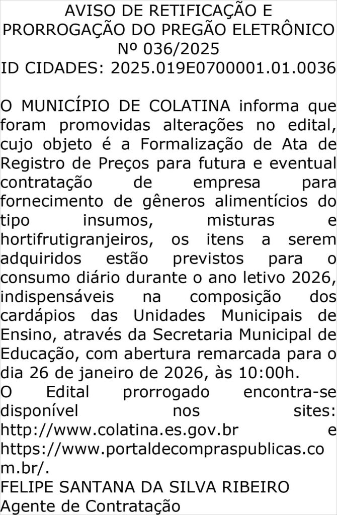 PREFEITURA MUNICIPAL DE COLATINA – Nº 245 – COLATINA – ES, DIA 14 DE JANEIRO DE 2026