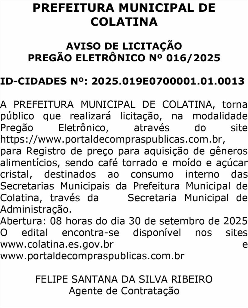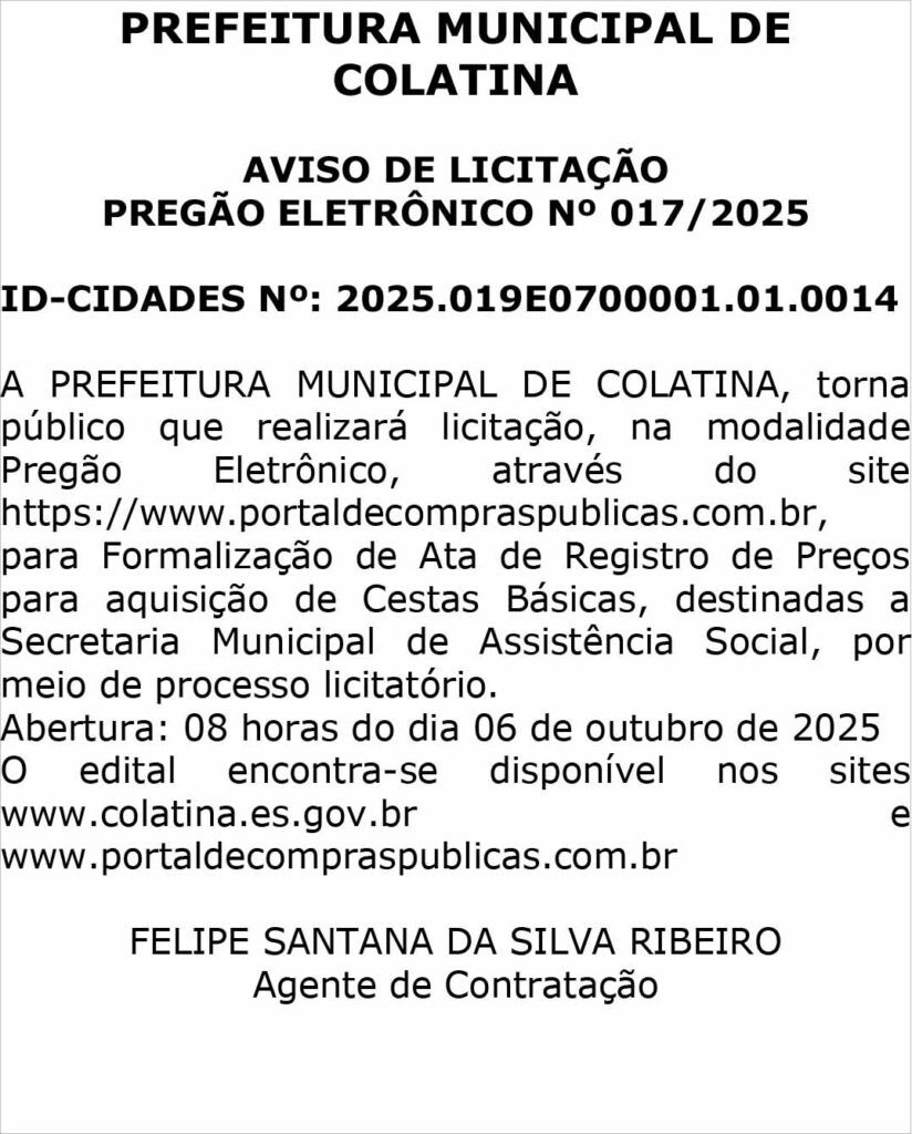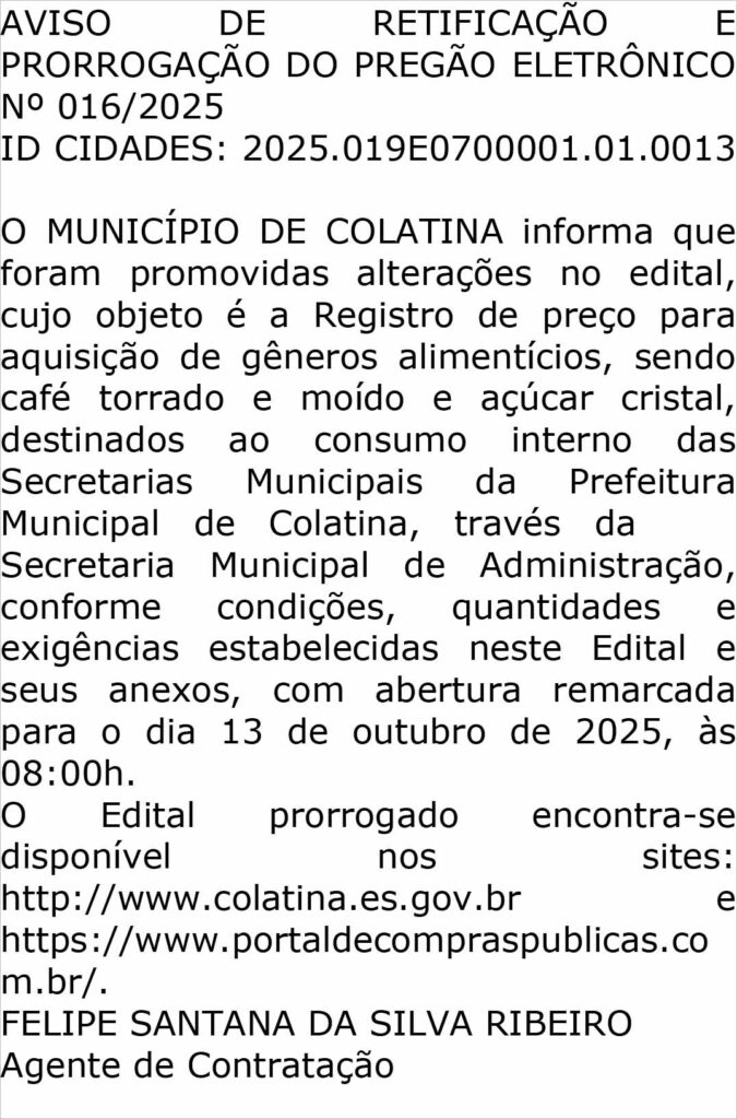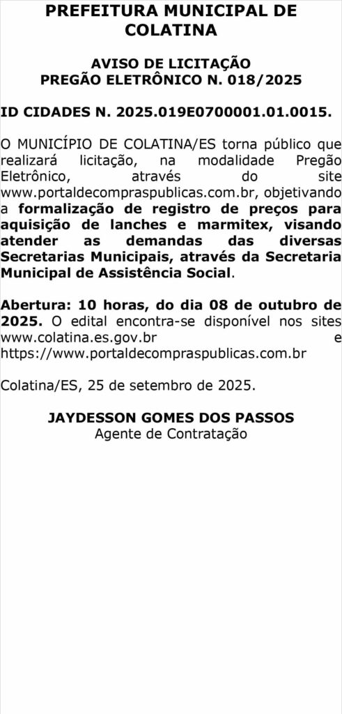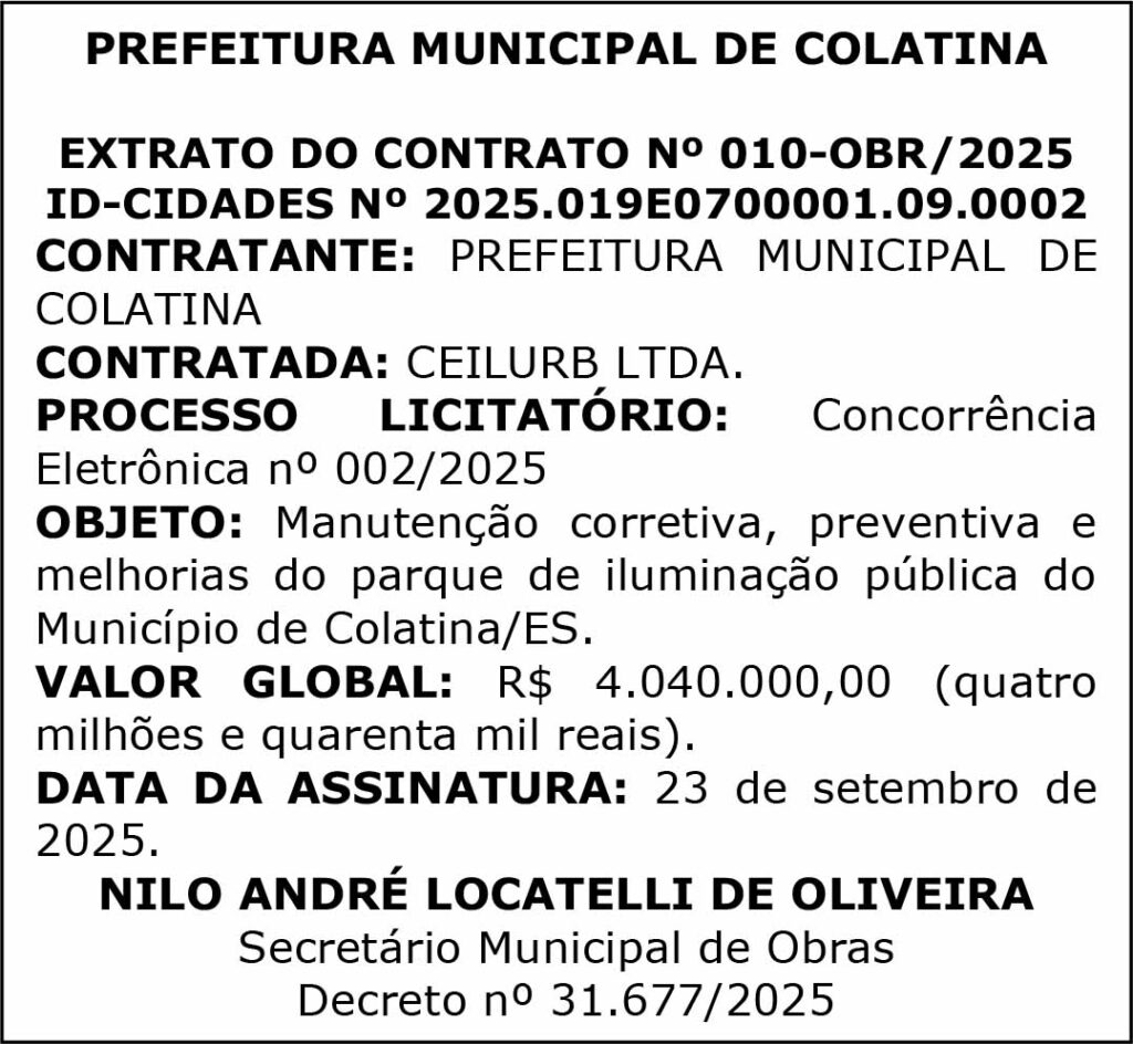 PREFEITURA MUNICIPAL DE COLATINA – Nº 210 – COLATINA – ES, DIA 24 DE SETEMBRO DE 2025