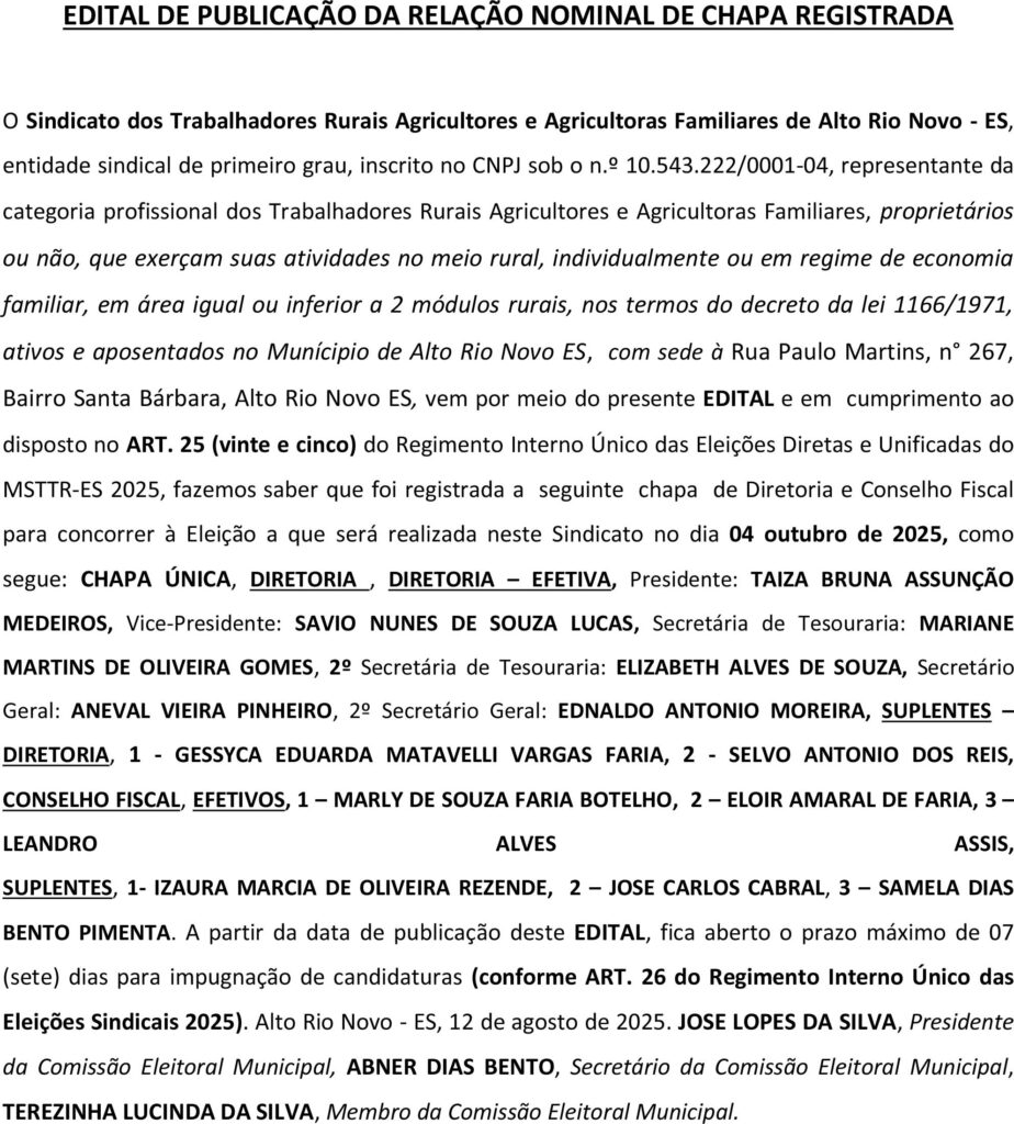 O Sindicato dos Trabalhadores Rurais Agricultores e Agricultoras Familiares de Mantenópolis – ES, entidade sindical de primeiro grau, inscrito no CNPJ sob o n.º 27.154.392/0001-08, representante dos trabalhadores que, integram a Categoria profissional dos trabalhadores rurais agricultores e agricultoras familiares, ativos e aposentados, proprietário ou não, que exerçam suas atividades no meio rural, individualmente ou tem regime de economia familiar, nos termos do Decreto lei 1166/1971, em área igual ou inferior a 02(dois) módulos rurais, no Município de Mantenópolis Espirito Santo com sede à Rua Ataíde Alves nº 19 Centro Mantenópolis ES vem por meio do presente EDITAL e em cumprimento ao disposto no ART. 25 (vinte e cinco) do Regimento Interno Único das Eleições Diretas e Unificadas do MSTTR-ES 2025, fazemos saber que foi registrada a seguinte chapa de Diretoria e Conselho Fiscal para concorrer à Eleição a que será realizada neste Sindicato nos dia 05 de outubro de 2025 como segue: