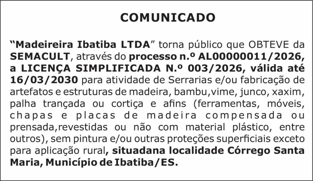 COMUNICADO DA LICENÇA SIMPLIFICADA N.º 003/2026 Adalberto Batista Publicidade Legal 17 de abril de 202617 de abril de 2026 0 Comentário COLATINA – ES, DIA 17 DE ABRIL DE 2026