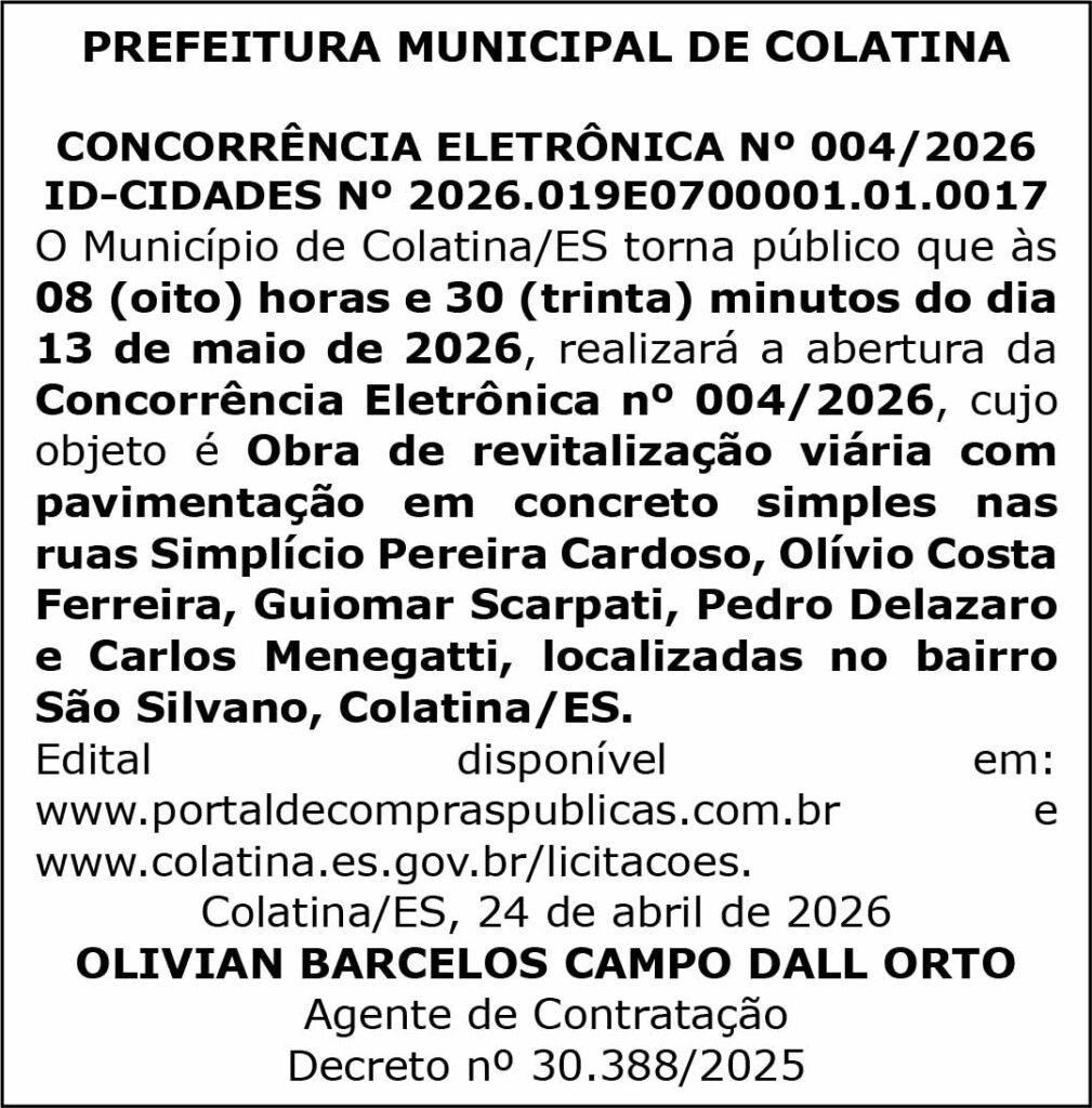 CONCORRÊNCIA ELETRÔNICA Nº 004/2026 – PMC Adalberto Batista Publicidade Legal 24 de abril de 202624 de abril de 2026 0 Comentário PREFEITURA MUNICIPAL DE COLATINA – Nº 274 – COLATINA – ES, DIA 24 DE ABRIL DE 2026