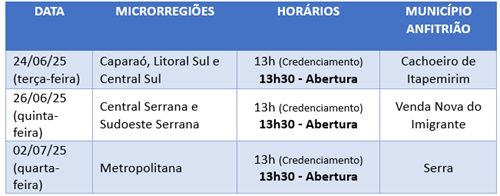 O próximo evento acontece no dia 24 de junho (terça-feira), a partir das 13 horas, no auditório do CEEFMTI Francisco Coelho Ávila Júnior (Rua Pedro Silvan, S/N – Coronel Borges), em Cachoeiro de Itapemirim/ES. Na ocasião, serão debatidas propostas de projetos e ações para as microrregiões Caparaó, Litoral Sul e Central Sul.
