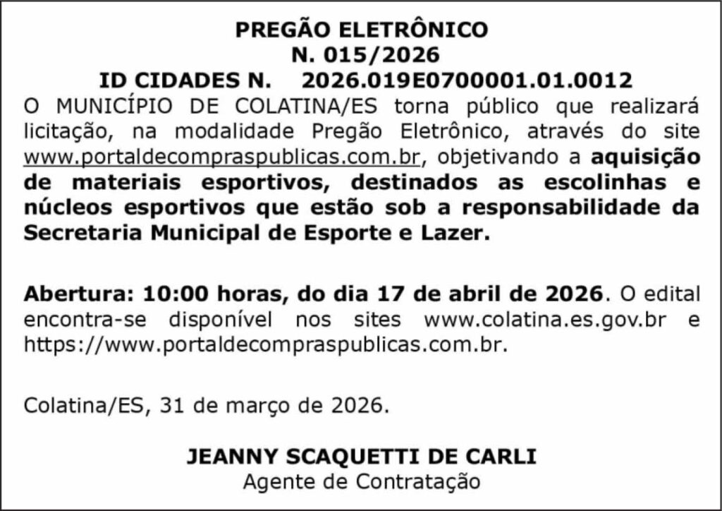 PREGÃO ELETRÔNICO N. 015/2026 – PMC Adalberto Batista Publicidade Legal 1 de abril de 20261 de abril de 2026 0 Comentário PREFEITURA MUNICIPAL DE COLATINA – Nº 264 – COLATINA – ES, DIA 01 DE ABRIL DE 2026