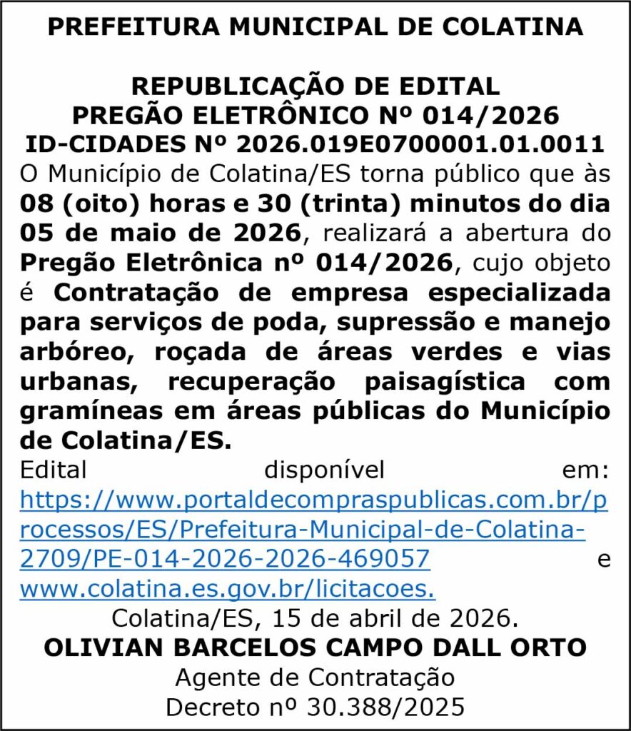 REPUBLICAÇÃO DE EDITAL PREGÃO ELETRÔNICO Nº 014/2026 – PMC Adalberto Batista Publicidade Legal 15 de abril de 202615 de abril de 2026 0 Comentário PREFEITURA MUNICIPAL DE COLATINA – Nº 269 – COLATINA – ES, DIA 15 DE ABRIL DE 2026
