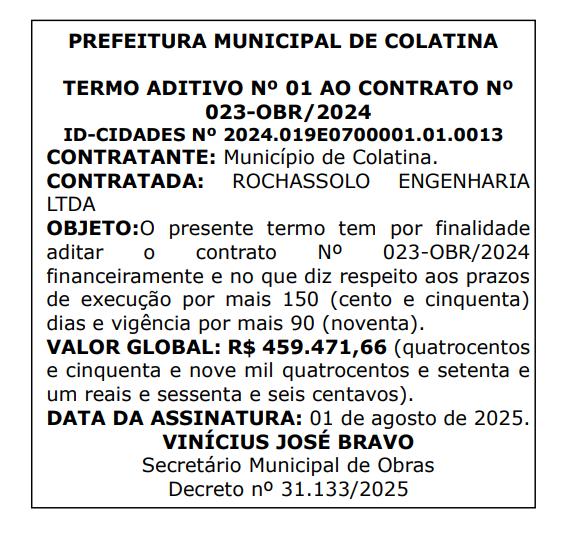 TERMO ADITIVO Nº 01 AO CONTRATO Nº 023-OBR/2024 – PMC afolhaonline Publicidade Legal 2 de agosto de 2025 0 Comentário PREFEITURA MUNICIPAL DE COLATINA – Nº 198– COLATINA – ES, DIA 02 DE AGOSTO DE 2025